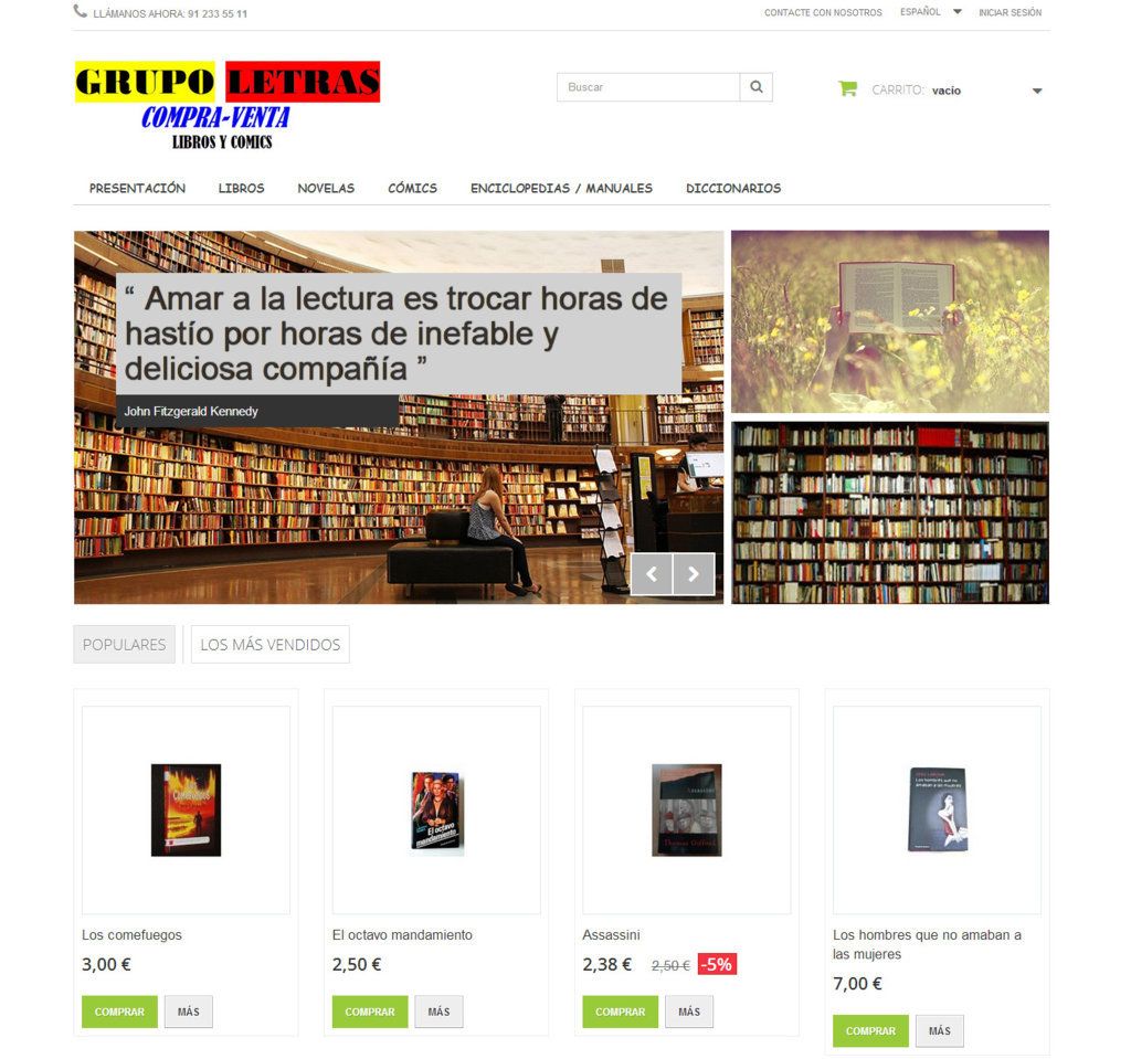 Página diseñada en CMS Prestashop para empresa de venta de libros nuevos y usados. El trabajo ha sido compuesto para la venta de libros, comics, enciclopedias, etc.